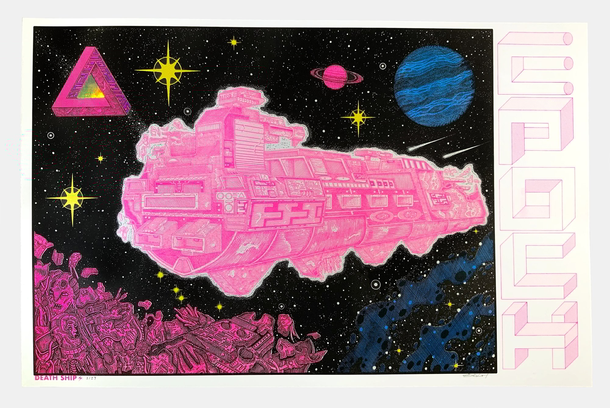 Four color risograph printed by Tiny Splendor, on white card stock. Finished with holographic detail, signed and numbered. Measures 11"x17"