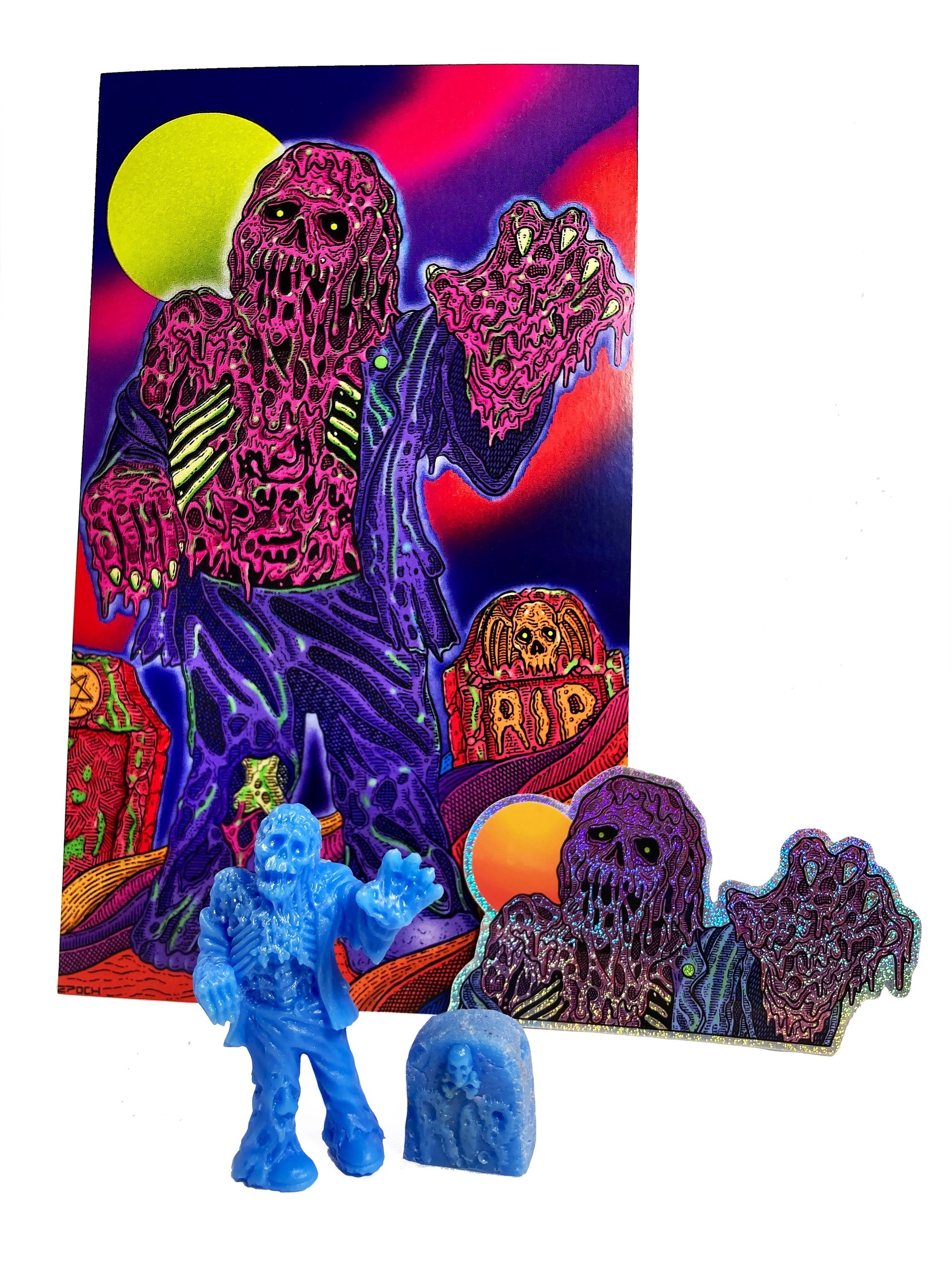 This figure was beautifully sculpted by the master Thomas Hensley. The tombstone and artwork was done by Jaime V (EPOCH). It was casted in fluorescent resin and finished with a touch of mystic gold. Includes a holographic decal, 6"x10" art print and header card. Edition of 16, Signed and numbered.